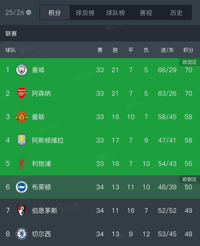 曼城本赛季在少赛一轮的情况下一度落后榜首阿森纳9分,随着阿森纳在联赛进入4月后连续不敌伯恩茅斯和曼城,积分优势已缩小至3分。本轮曼城战胜伯恩利全取3分,两队积分差距被抹平。