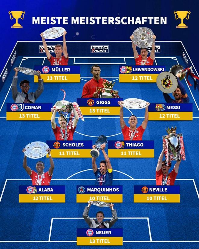北京时间4月21日,德转统计出了欧洲五大联赛历史上夺冠次数最多的11人阵容,梅西领衔,托马斯-穆勒、莱万多夫斯基、吉格斯、诺伊尔上榜。