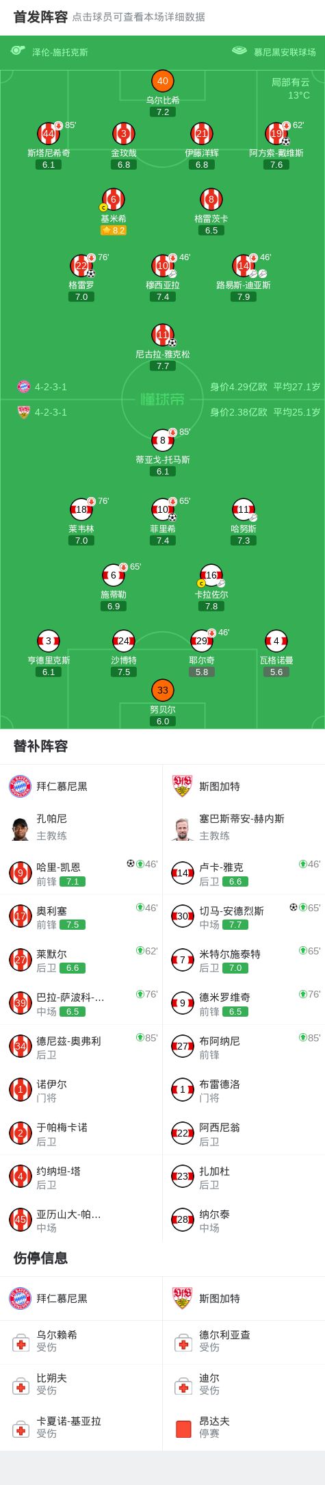 北京时间4月19日德国足球顶级联赛 联赛 第30轮,拜仁慕尼黑主场对阵斯图加特。拜仁慕尼黑格雷罗破门,尼古拉-雅克松破门,阿方索-戴维斯破门,哈里-凯恩破门。斯图加特菲里希破门,切马-安德烈斯破门。最终比分拜仁 4-2 斯图加特。