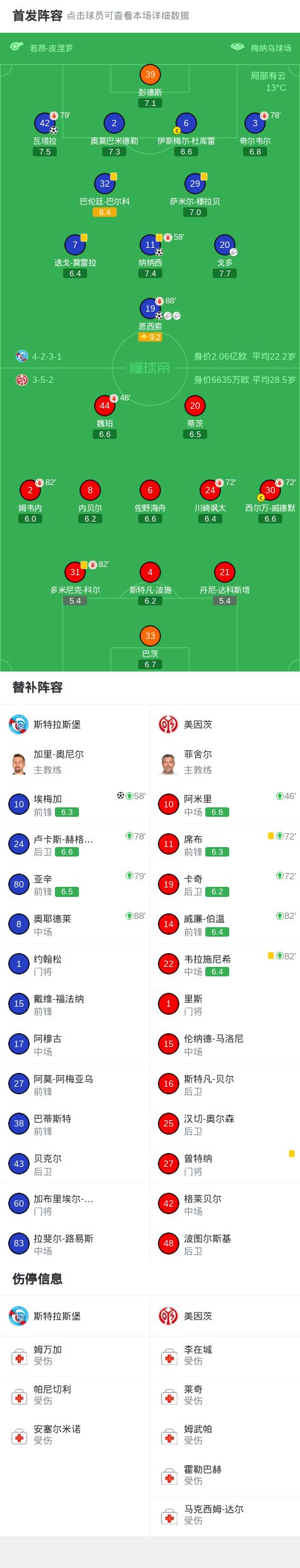 第35分钟,恩西索传中,瓦塔拉抢点头槌破门,斯特拉斯堡2-0